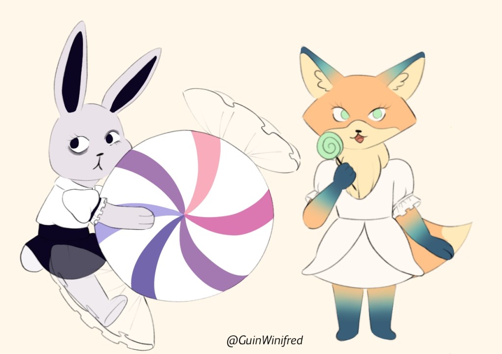 Swapped outfits with friend’s OC (left). I have to admit that I did rush a little with this one so the colours look a little off. Still looks somewhat cute tho~
